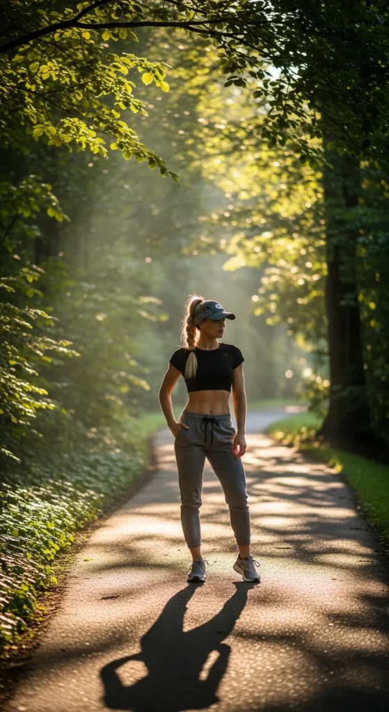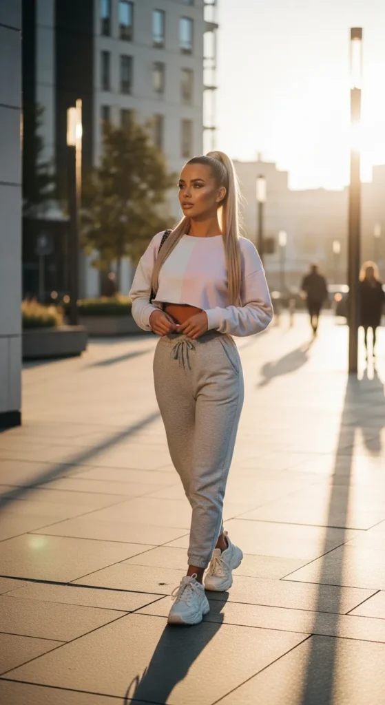 For a sporty energy, pair gray joggers with a fitted athletic crop top. This look feels active and confident, perfect for casual walks, errands, or laid-back fitness days.