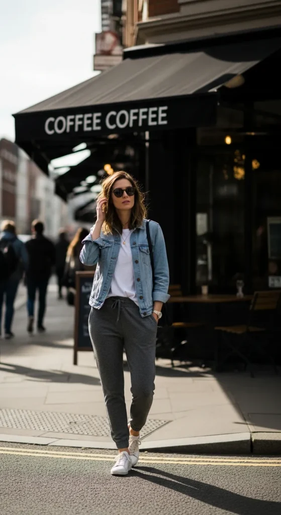 A denim jacket over a simple tee with gray joggers creates an easy everyday outfit that feels relaxed but stylish enough for spontaneous plans.