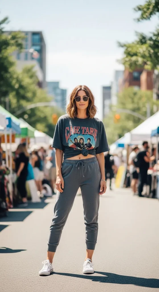 A vintage-inspired graphic tee gives gray joggers personality. It adds color and visual interest while keeping the overall look playful and casual, perfect for summer concerts, casual hangouts, or weekend markets.