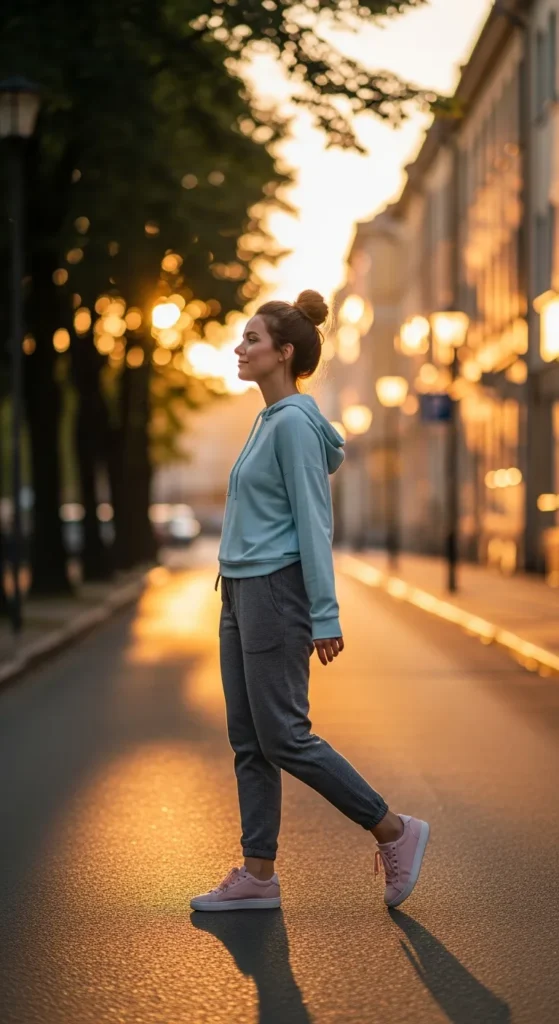 For cooler summer evenings, a lightweight hoodie with gray joggers feels cozy and relaxed. This combination is perfect for sunset walks, late coffee runs, or casual travel days when comfort becomes the priority.