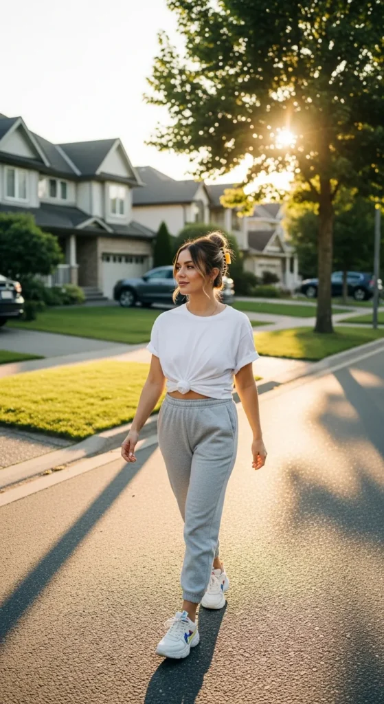 An oversized tee tucked slightly into gray joggers creates the ultimate off-duty outfit. It feels cozy, casual, and effortlessly cool for everyday comfort.