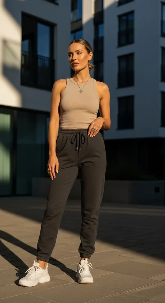 A fitted ribbed tank paired with gray joggers creates that perfect balance of relaxed and flattering. The slim top contrasts beautifully with the loose joggers, making the outfit ideal for hot days when you want simplicity with shape.
