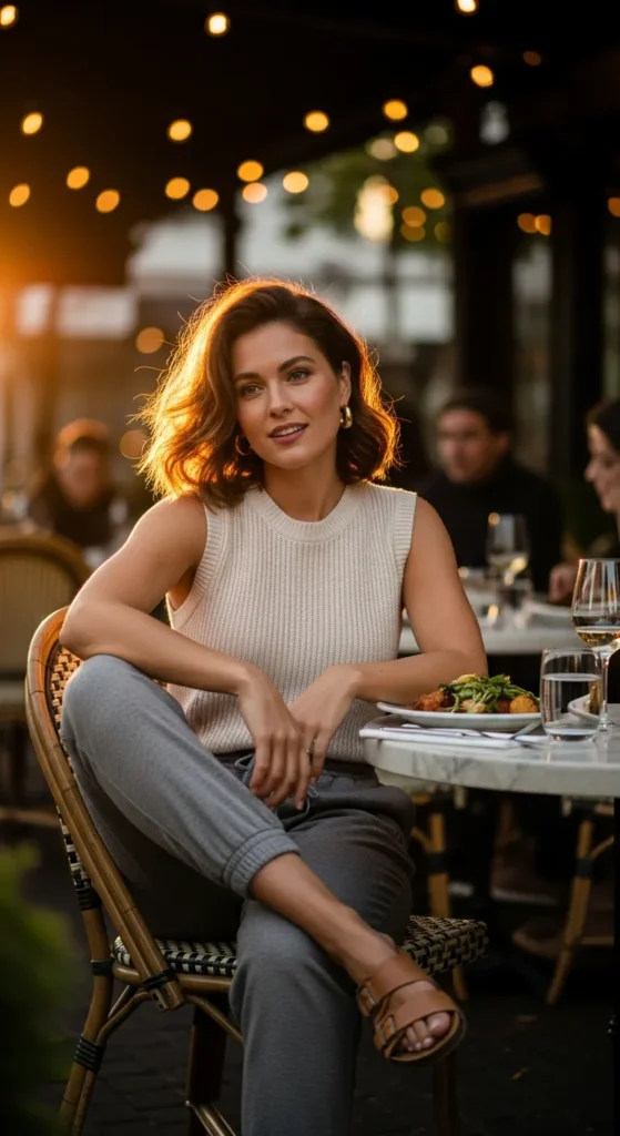 A sleeveless knit top adds texture while staying breathable for summer. Paired with gray joggers, it feels relaxed yet refined enough for casual dinner outings.