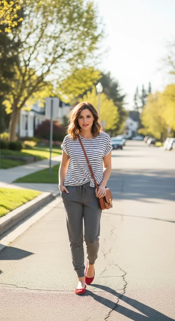 A classic striped tee brings timeless charm to gray joggers. The combination feels effortless and Parisian-inspired while remaining incredibly comfortable for everyday errands.
