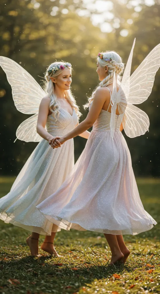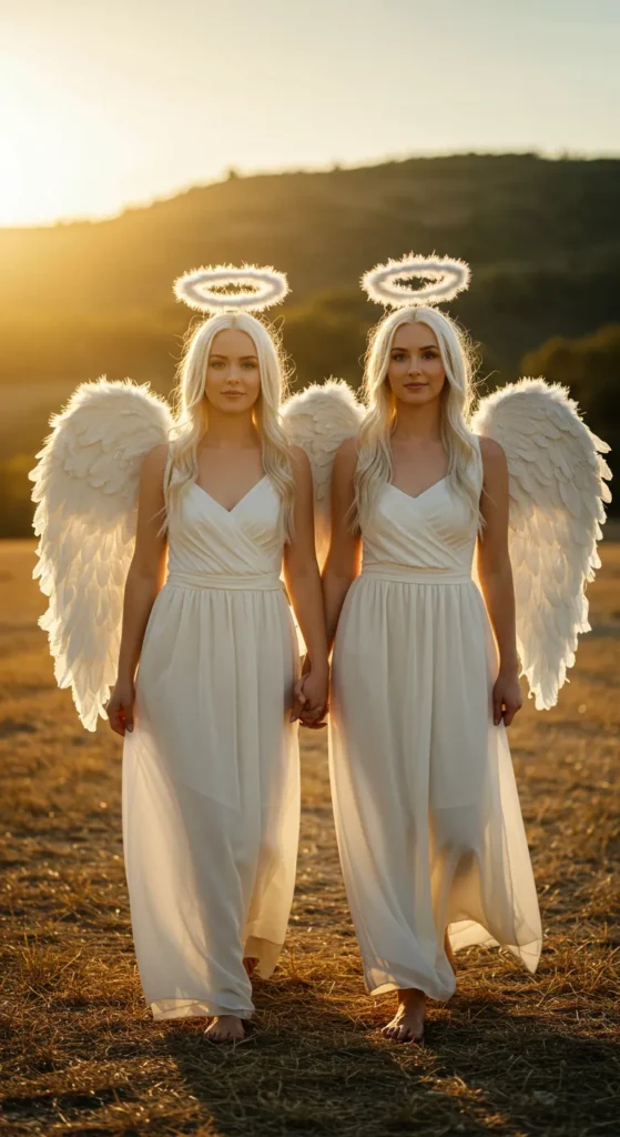 Perfect for best friends who prefer something elegant. Flowing white dresses with halos and wings create a soft, glowing effect.
