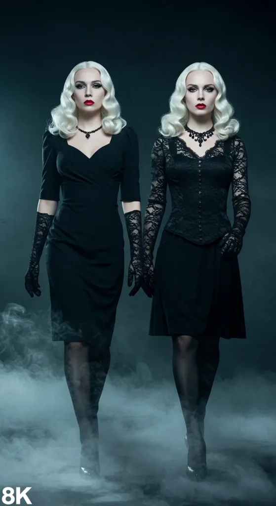 Elegant with a dark twist. Black fitted dresses, lace gloves, and bold makeup create a powerful visual.