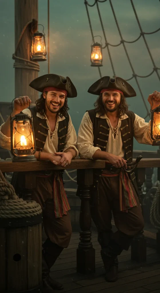 Loose shirts, sashes, boots, and hats bring an adventurous pirate duo to life. A great option for best friends who like bold looks.