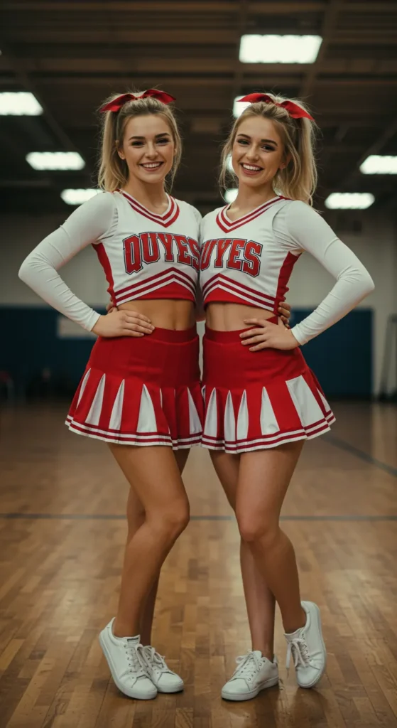 A fun, upbeat costume. Matching cheer outfits, high ponytails, and sneakers bring a nostalgic school vibe.