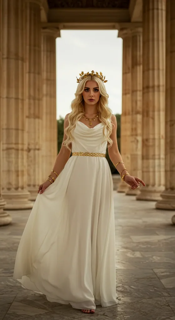 White silk, gold cuffs, and soft glowing skin — this look makes you feel divine. Inspired by Aphrodite, it’s equal parts power and grace. Every movement is poetry; every photo is a masterpiece.