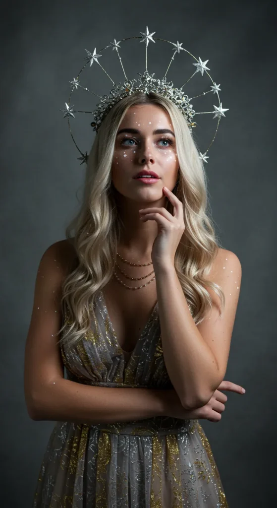 Imagine stepping into a room glowing in gold and silver. Your gown catches the light like stardust, and the celestial crown resting on your hair makes you look like you were born from the night sky itself. This isn’t a costume — it’s cosmic energy in fabric form.