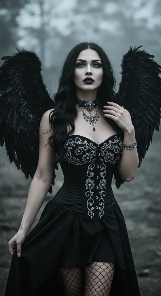 Soft yet untouchable — that’s your vibe. Black feathered wings stretch from your shoulders, your corset hugs your silhouette, and your smoky eyes dare anyone to look away. You’re not fallen… you’re just done following rules.