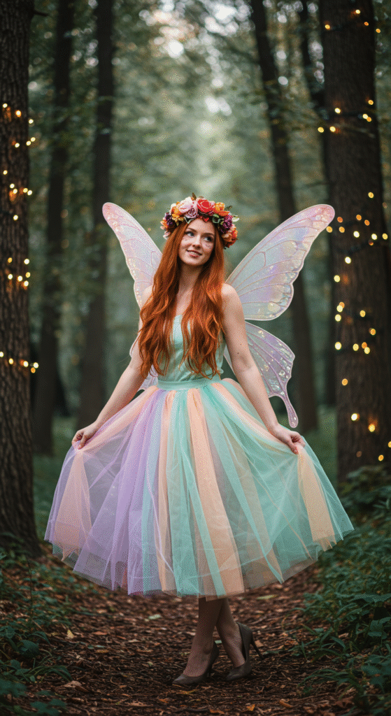Think fluttering tulle, pastel wings, and sunlight dancing through petals. You’re the spirit of autumn itself — light, playful, and a little untamed. Add a floral crown and you’ll look like you just stepped out of a storybook.