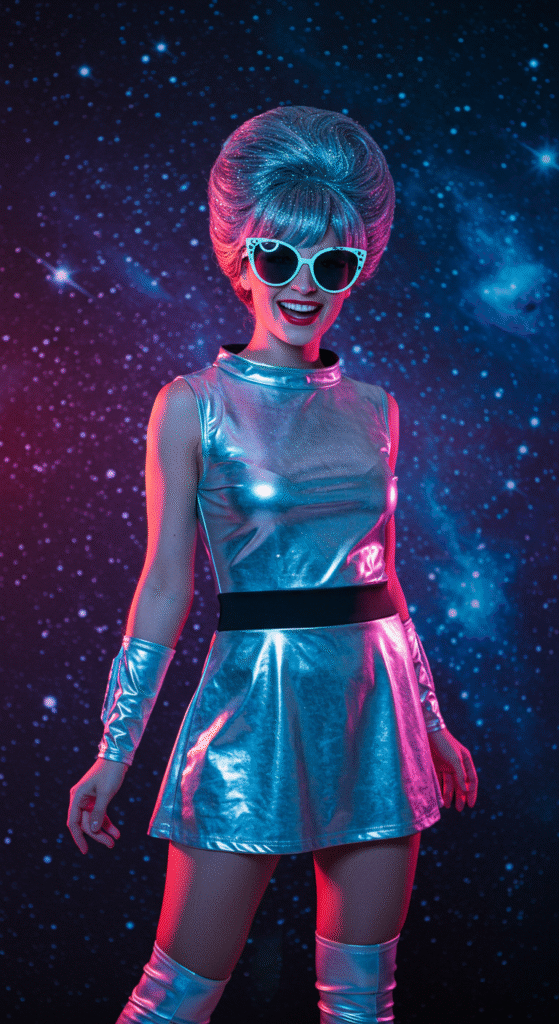 Metallics, mirror shine, and fearless attitude — channel the 60s sci-fi heroine energy. A silver mini dress with go-go boots and bold eyeliner gives you that futuristic-but-fabulous vibe. You don’t orbit the spotlight; you are it.