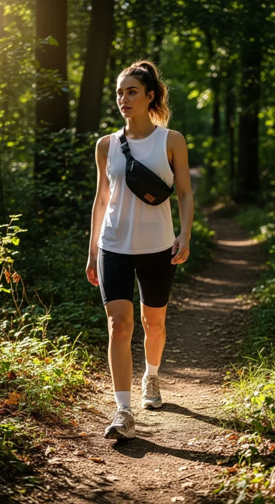 A sleek tank top paired with black biker shorts gives a modern twist to hiking gear. Stretchy, moisture-wicking materials make uphill climbs easier while staying effortlessly cool.