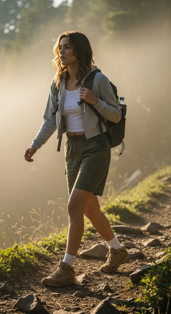 A lightweight cropped hoodie over a tank paired with olive cargo shorts balances warmth and ventilation. Perfect for early morning hikes when temperatures are cooler.