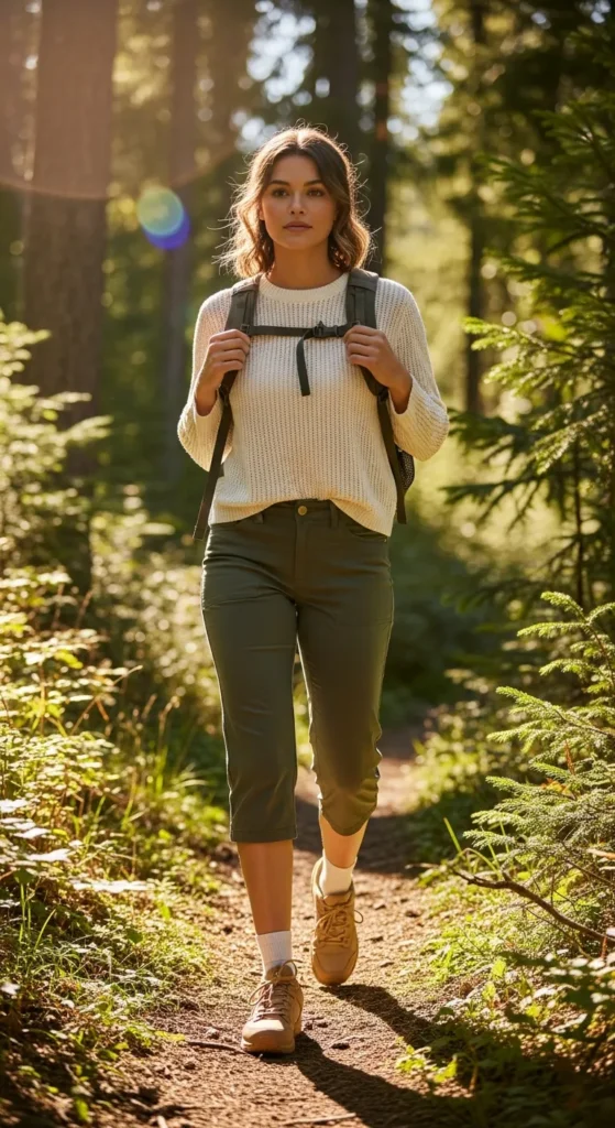 A breathable knit top paired with cropped capri hiking pants blends comfort and elegance. Soft textures prevent chafing while staying chic for trail photos.