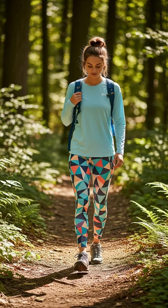A lightweight, long-sleeve UV-protective shirt paired with geometric-patterned leggings gives coverage and style. Bright patterns add personality while the top keeps sun exposure minimal.