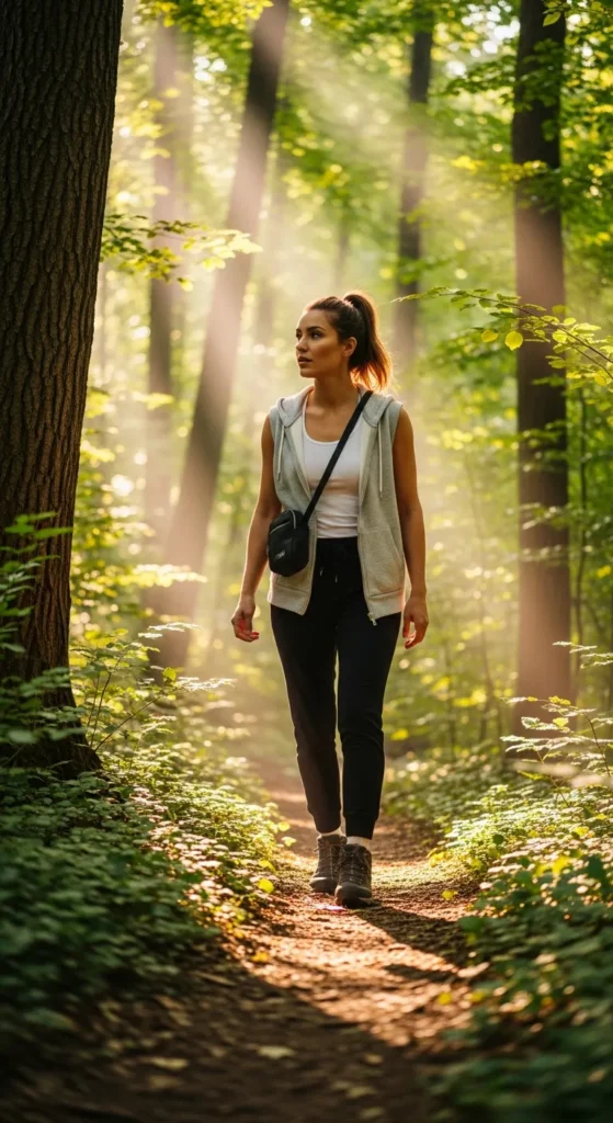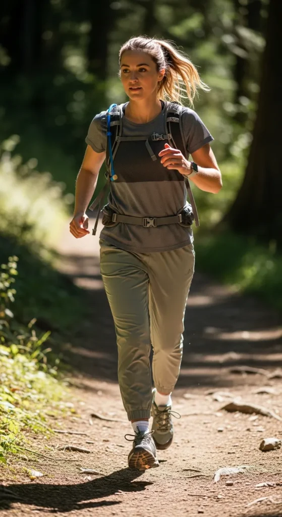 A sleeveless hoodie layered over a fitted tank with slim joggers creates a sporty silhouette. Perfect for mixed-terrain hikes, balancing warmth and movement.