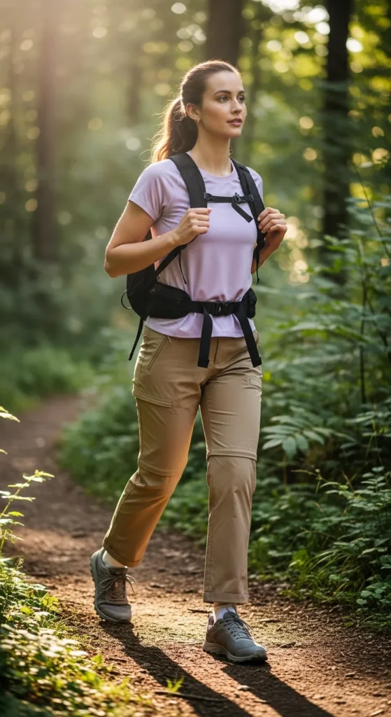 A pastel moisture-wicking tee paired with tan convertible hiking pants ensures comfort and adaptability as temperatures change. Functional and lightweight, this outfit keeps you moving freely on uneven terrain.