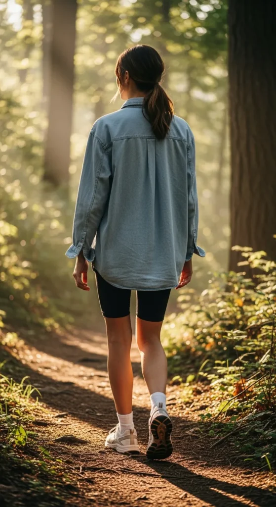 An oversized chambray shirt over black biker shorts offers a relaxed, on-trend hiking look. The loose top allows airflow while shorts ensure mobility.