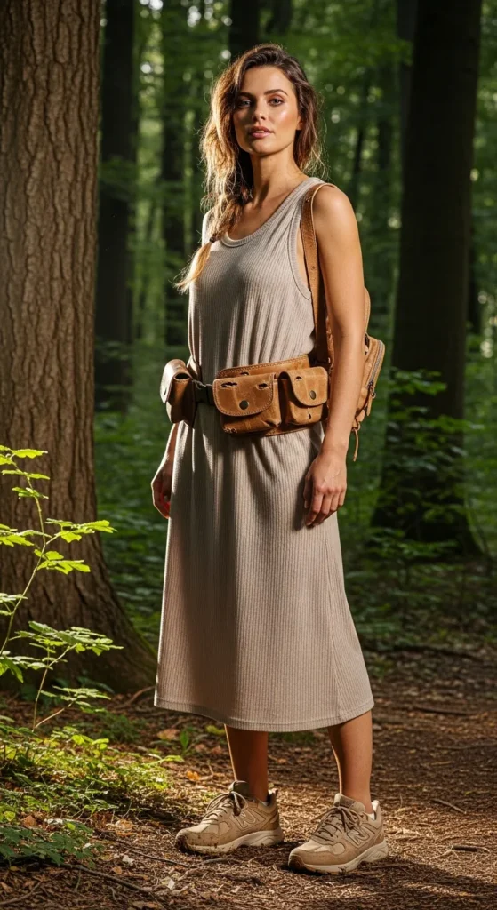A relaxed-fit tank dress paired with a utility belt backpack provides effortless style while carrying essentials. Neutral tones make it functional yet polished for an outdoor brunch post-hike.