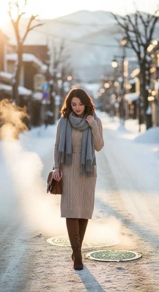 A chunky cream cable-knit sweater paired with a soft gray pleated midi skirt balances warmth and elegance. Knee-high leather boots complete this cozy, feminine vibe perfect for Hokkaido’s snowy streets.