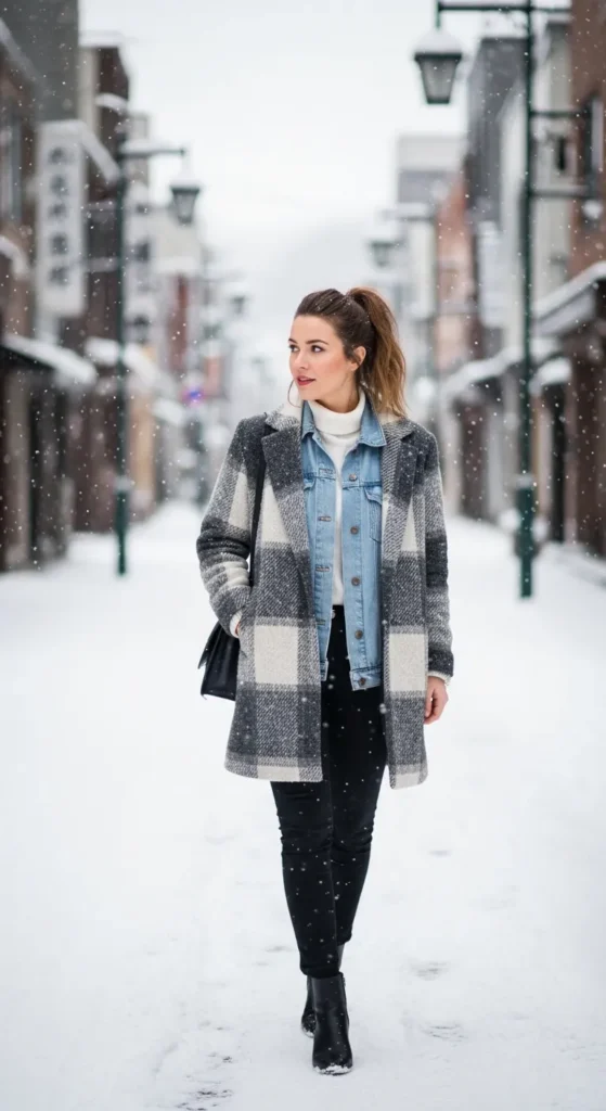 A mid-length checked coat over a light denim jacket and turtleneck offers layered warmth. Pair with black boots for a street-smart look.
