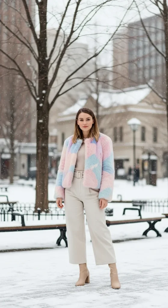 A soft pastel faux fur jacket with high-waisted wide-leg trousers creates luxurious winter vibes. Heeled ankle boots add height and polish.