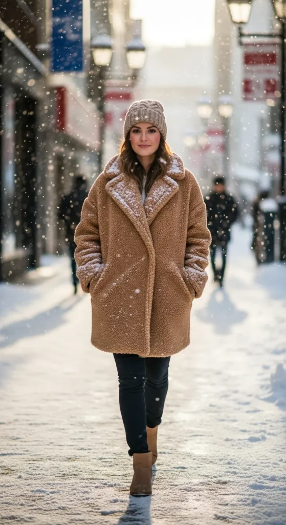 A camel teddy coat paired with dark skinny jeans and ankle boots is effortless chic. The soft texture keeps you warm while the jeans balance proportion.