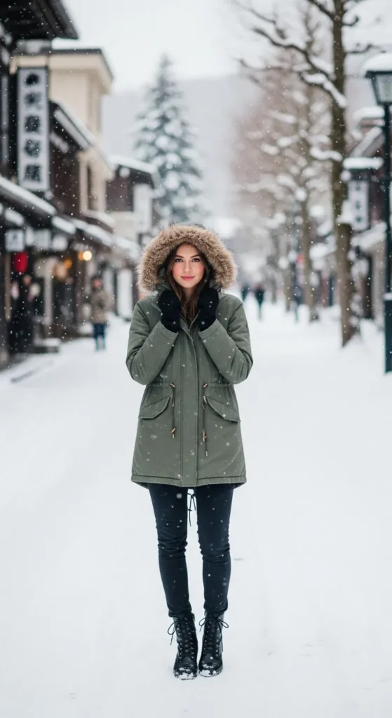 A muted green hooded parka with faux fur trim over dark skinny jeans is street-ready and cozy. Pair with lace-up boots.