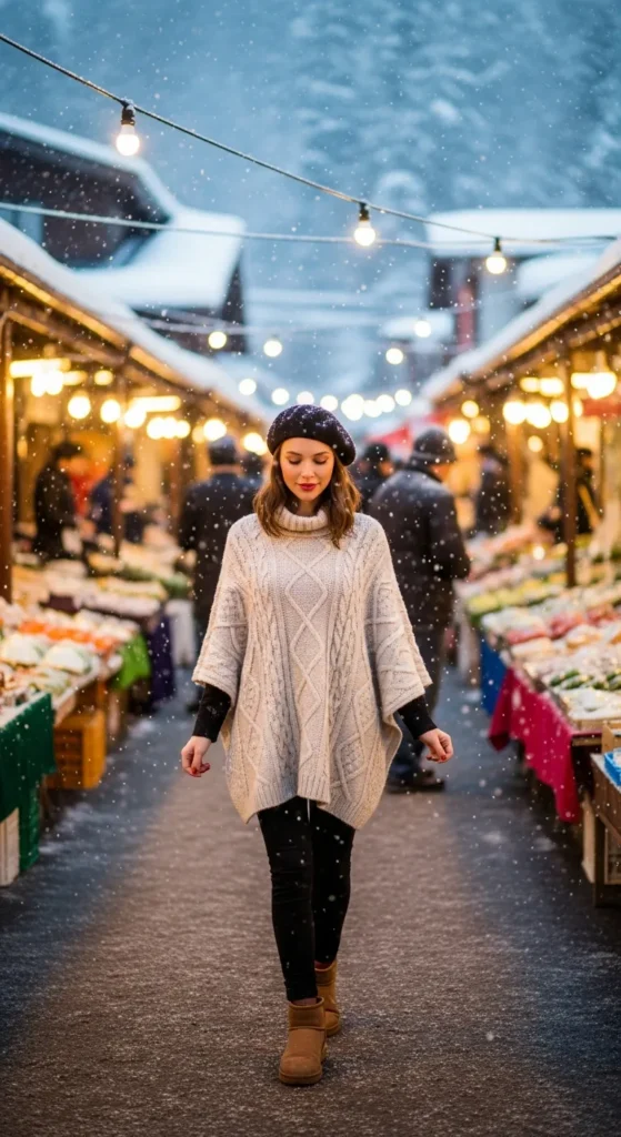A cable knit poncho with fitted leggings and suede boots offers effortless warmth and style. Perfect for exploring open-air markets.
