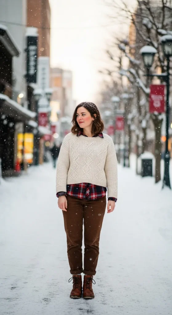 A plaid shirt under a cream knit sweater, paired with corduroy trousers, mixes patterns and texture for casual chic winter style.