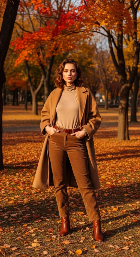 Layer a beige turtleneck under a camel oversized wool coat with straight-leg corduroy pants. This outfit combines relaxed elegance with warmth. Ankle boots tie the look together.