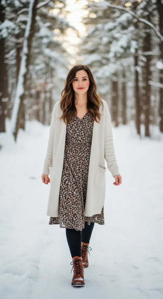 Layer a cozy cream longline cardigan over a patterned midi dress with opaque tights. Pair with lace-up boots for a timeless Hokkaido aesthetic.