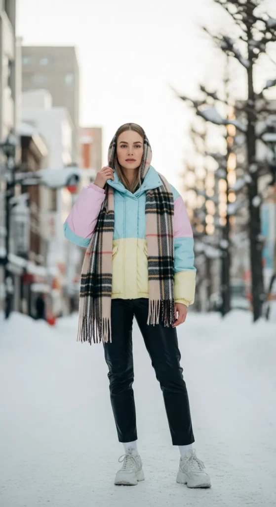 A muted pastel puffy jacket paired with black leather pants and chunky sneakers gives a modern streetwear edge suitable for snowy sidewalks. A plaid scarf adds a classic accent.