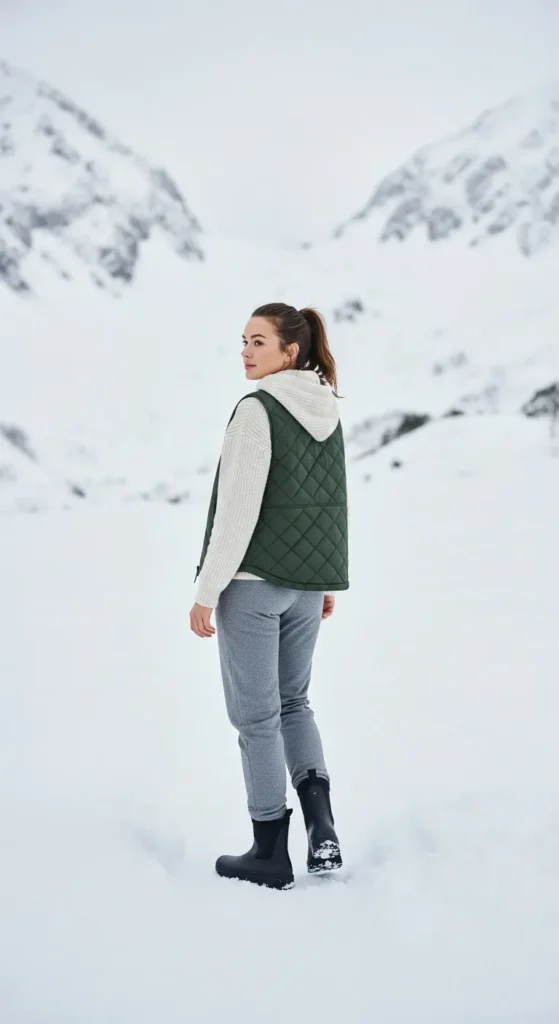 A dark green quilted vest layered over a cream hoodie with tapered joggers is sporty yet chic. Waterproof boots complete the functional look.