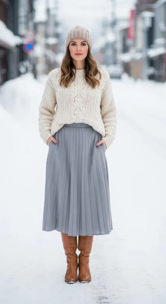 1. Snowy Cable-Knit Sweater & Pleated Midi Skirt