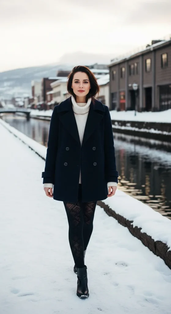 A navy wool peacoat over a cream turtleneck sweater and patterned tights is stylish and practical. Short leather boots ensure warmth while offering a chic street-ready appearance.