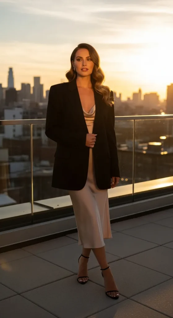 Layering a structured blazer over a silky slip dress blends softness with strength. This outfit feels romantic yet confident, perfect for evening dinners or special occasions where understated elegance stands out.