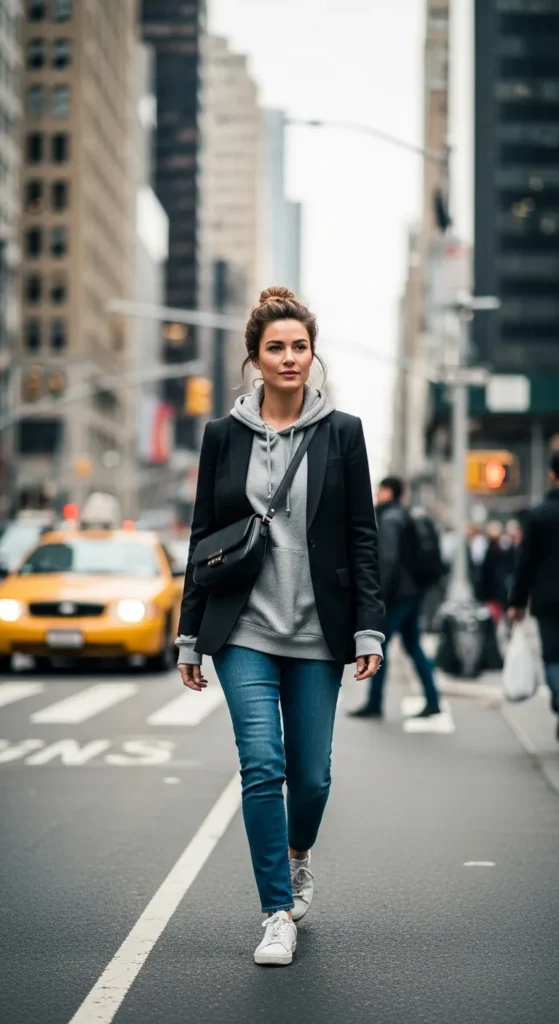 Layering a hoodie under a blazer creates a cozy yet structured street-style look. It blends comfort and tailoring, making it perfect for transitional weather or laid-back outings.