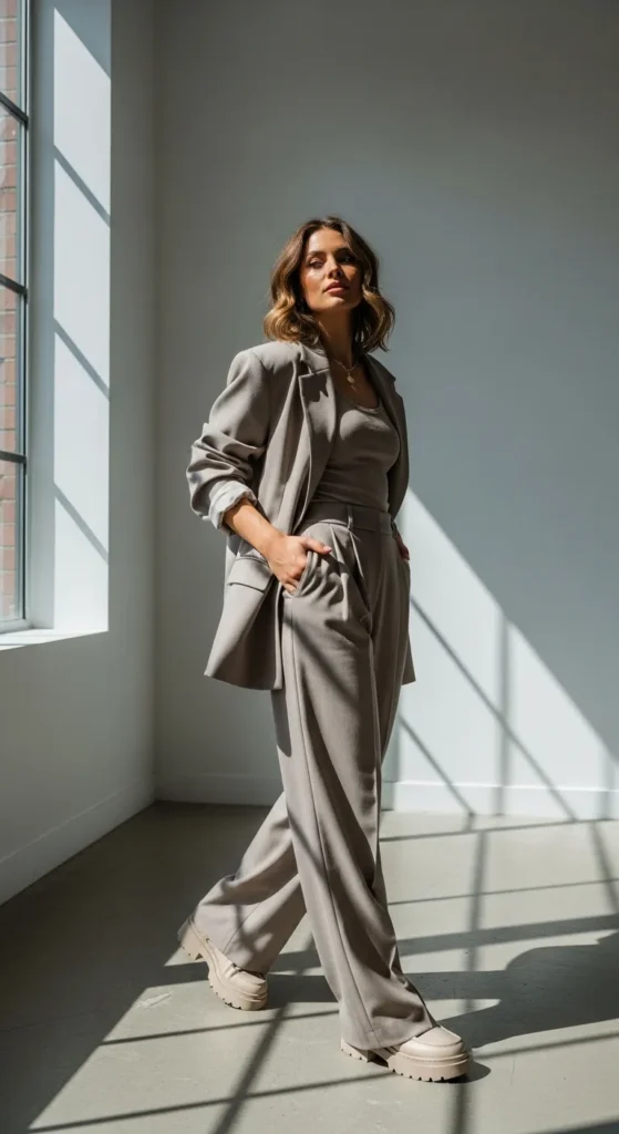 A relaxed blazer paired with wide-leg trousers creates a fluid, elongated silhouette. It feels powerful yet soft, ideal for days when comfort and style need to coexist seamlessly.