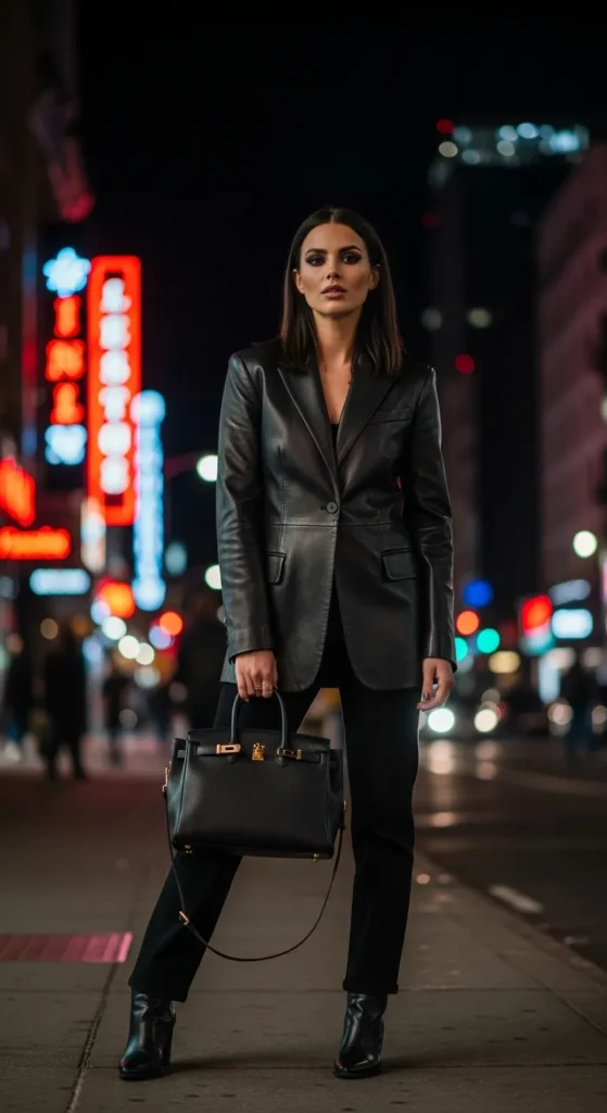 Stylist Suggestion: Pair with sleek boots and a structured bag. Keep hair straight and polished to match the sharp texture of leather.