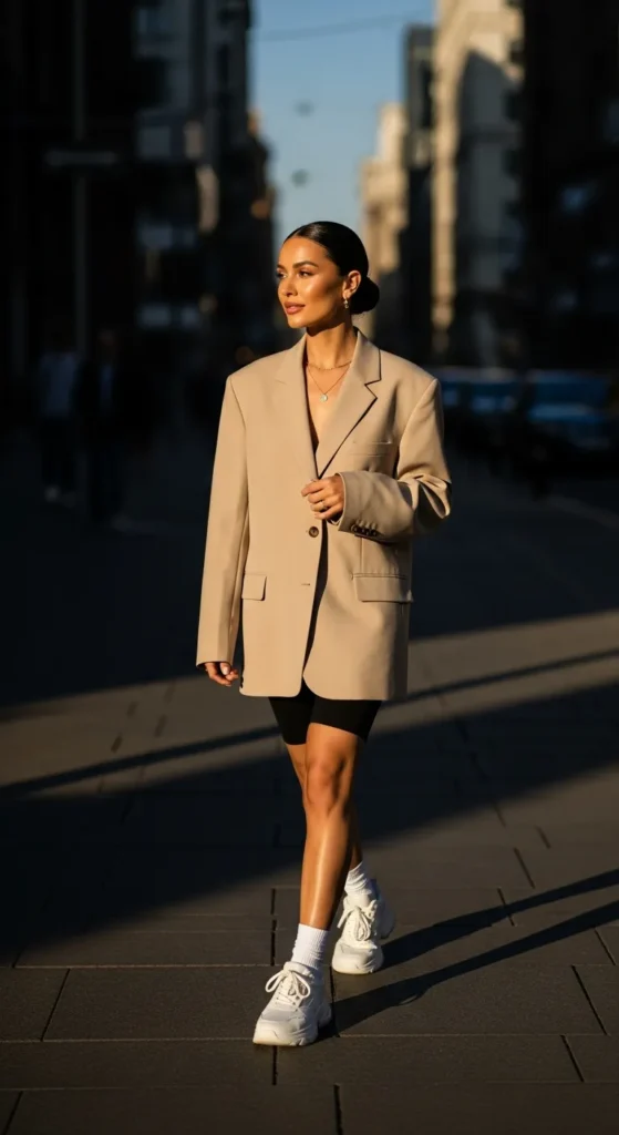 An oversized blazer paired with fitted bike shorts creates a striking balance between structure and ease. This outfit feels bold yet comfortable, perfect for casual city days or quick coffee runs with an elevated twist.