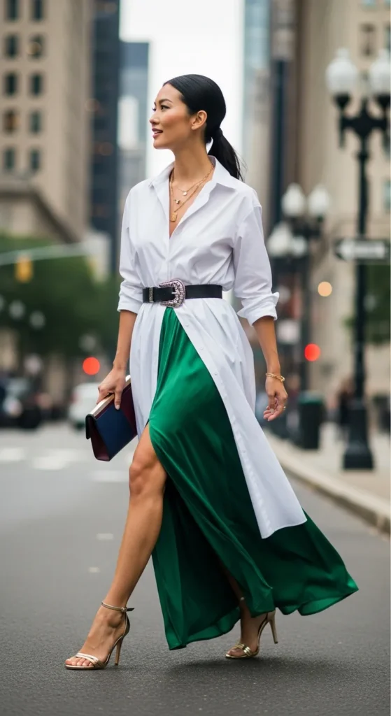 A structured white shirt tucked into a high-slit maxi skirt adds a hint of bold sophistication. The contrast between crisp tailoring and fluid fabric creates a striking yet wearable day-to-evening transition outfit.