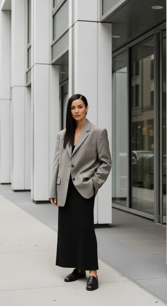 A tailored blazer over a simple maxi skirt instantly elevates the look. It’s the perfect mix of structured and relaxed, making it suitable for both work and casual meetings.