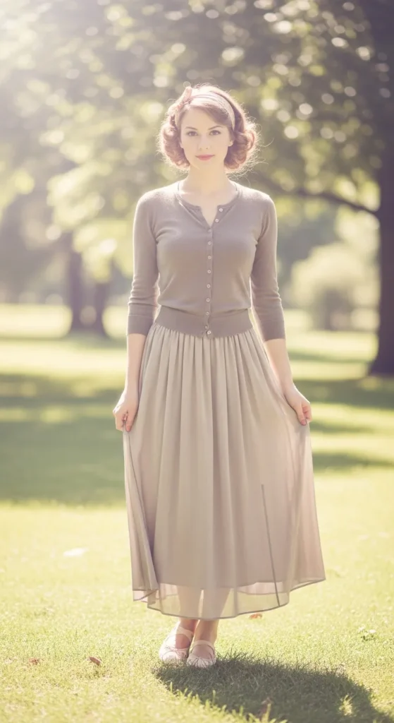 A buttoned cardigan worn as a top with a flowy maxi skirt creates a soft, vintage-inspired look. It feels warm, approachable, and quietly stylish.