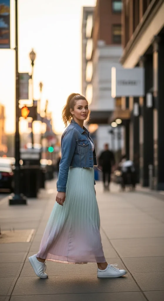 A pleated maxi skirt paired with a cropped denim jacket gives a playful mix of textures. The structured jacket balances the soft pleats, making the outfit feel youthful and approachable.
