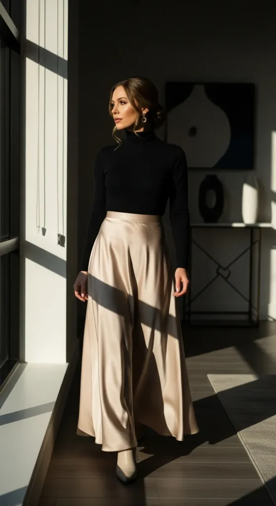 A fitted turtleneck tucked into a satin maxi skirt creates a sleek, elongated silhouette. The sheen of satin adds quiet luxury while the top keeps everything streamlined and refined.