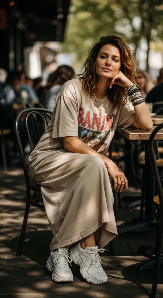 A relaxed graphic tee tucked into a neutral-toned maxi skirt offers a laid-back yet stylish vibe. It’s an easy blend of personality and simplicity that works for everyday wear.