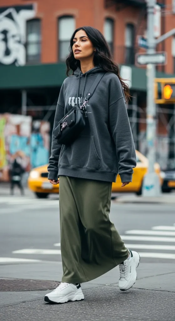 A cozy hoodie paired with a straight-cut maxi skirt blends comfort with unexpected style. The contrast between sporty and sleek makes this outfit feel modern and relatable.